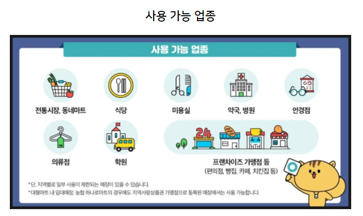 또한 프랜차이즈의 경우 본사 직영점이 아닌 가맹점만 사용할 수 있습니다. 전 매장을 본사에서 직접 운영하는 스타벅스 같은 매장에서는 사용할 수가 없습니다. 성형외과, 피부과 같은 병원과 명품을 파는 편집숍도 지역사랑상품권 가맹점이라면 사용할 수 있습니다.